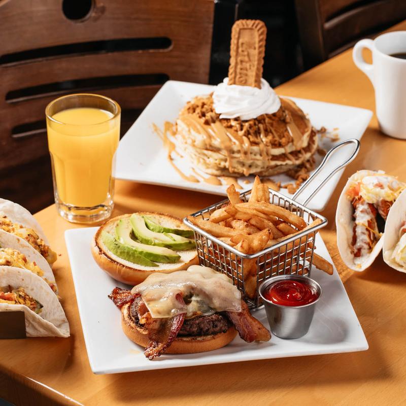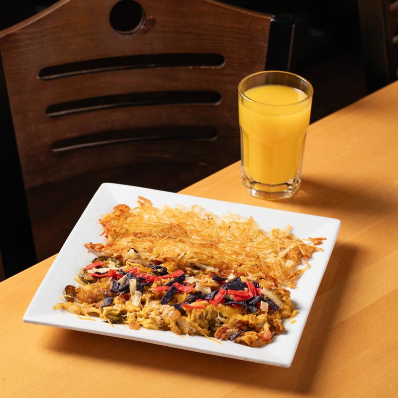 Loaded with hash browns, covered in Monterey and cheddar cheeses, and topped with two eggs any style. Served with a choice of Biscuit, Pancake, or Toast. Substitute Fresh Fruit +$2.99